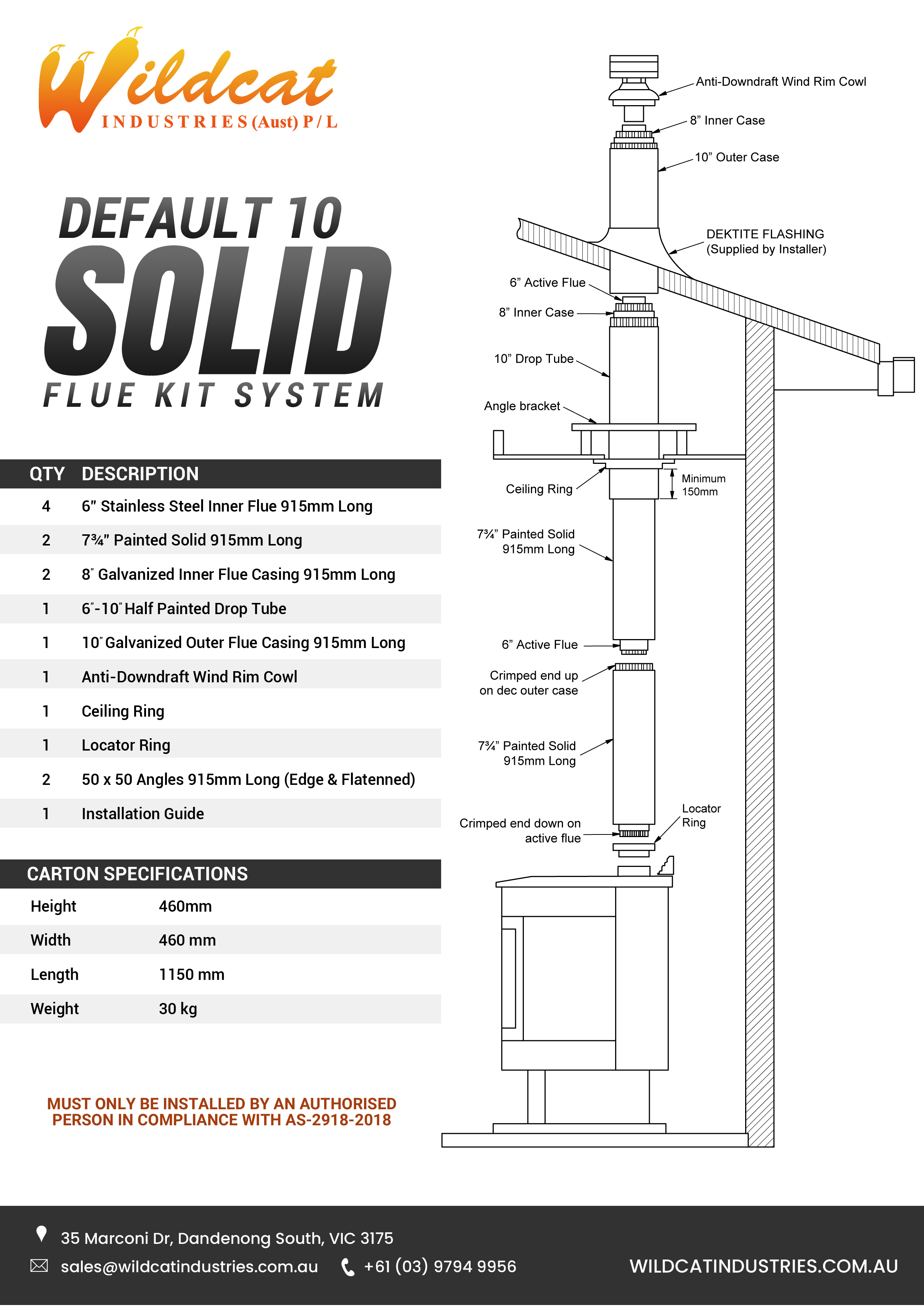 CAUTION: Mixing flue system components from different sources or modifying the dimensional specification of components may result in hazardous conditions. Where such actions is considered, WIldcat should be consulted in the first instance. It is the responsibility of the installer to ensure the installatin of this flue kit complies with the appliance manufacturers’ specifications for flue pipe shield and ceiling plate and that the relevant building codes are adhered to. Bends and extentions to the lenght of a flue system are permitted.